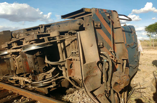 Uma das duas locomotivas de um trem de carga saiu dos trilhos e tombou neste sábado (22), em Santaluz. O acidente aconteceu no KM 313 da linha férrea, na altura da localidade conhecida como ‘Rua da Palha’, sentido ao município Queimadas. De acordo com informações obtidas pela reportagem, a composição estava vazia e seguia para o povoado de Cacimbas, na cidade de Itiúba, onde seria carregada. Havia três pessoas dentro da máquina, mas ninguém se feriu.